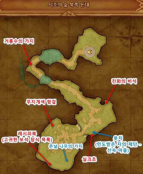 - 시조의 숲 북쪽 돈대 남서쪽 끝 보물상자에서는 레시피북 '고귀한 보석 장식 목록'(여왕의 장갑, 엘프의 부적의 레시피) 획득