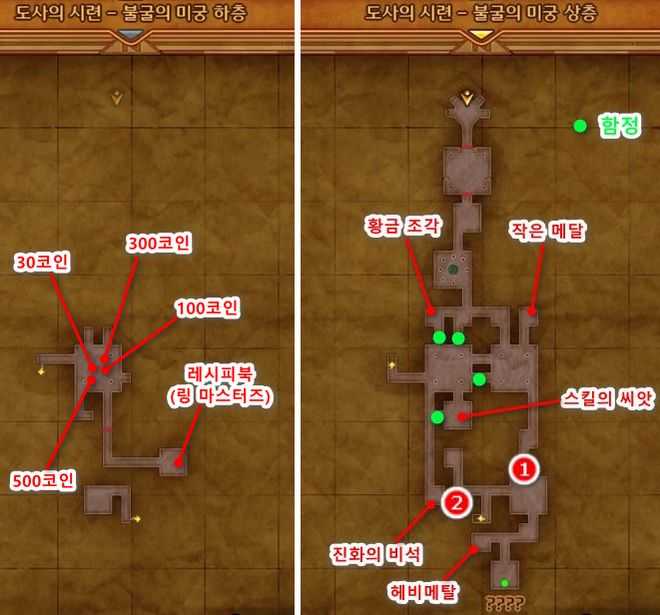 1. 불굴의 미궁 상층 남동쪽(아래 이미지의 숫자 1번위치)에 있는 함정에 빠지면, 하층 남동쪽 방으로 갈 수 있습니다.