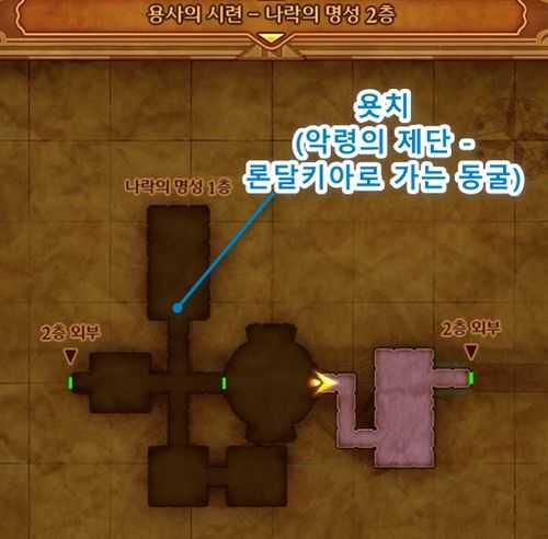 1. 나락의 명성 2층 북서쪽에 1층으로 내려가는 계단 앞에 있는 욧치와 대화하여 '악령의 제단'에 '론달키아로 가는 동굴'로 가는 암호를 획득합니다.