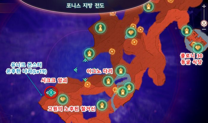 - 목적지 바로 서쪽 부근에는 유니크 몬스터 '온후한 나라'(Lv.19)가 출몰하므로 격파하고 가는 것도 좋을 것입니다. (최초 격파시에는 노폰코인 골드, 실버도 받을 수 있습니다)