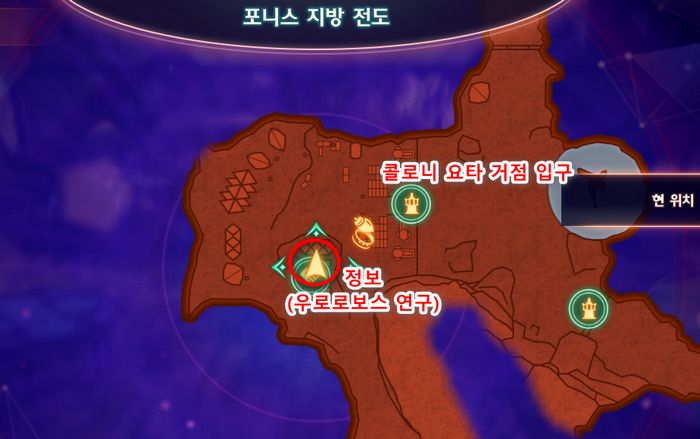 1. 포니스 지방 '콜로니 요타'의 야외식당 근처에서 '카스가'와 대화하여 정보(우로보로스 연구) 획득후, 휴식포인트에서 상담합니다.