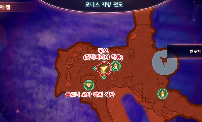 2. 포니스 지방 '콜로니 요타'에서 정보(컬렉피디아 악용) 획득후 휴식포인트에서 상담하여 퀘스트를 수주받습니다.