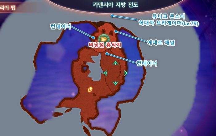 - 섬의 중앙 로케이션 '앤톨의 심연'에 에테르 채널 x3, 근처 절벽 위에 컨테이너(고순도 젬 스톤, 큰 날개 훈장 방패 등등)