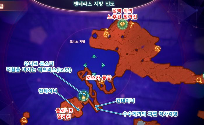 - 콜로니5 철거신 북동쪽에 유니크 몬스터 '적혈을 마시는 에브리스'(Lv.53) - (최초격파시 초고순도 젬 스톤, 노폰코인 골드, 노폰코인 실버, 수수께끼의 파편 환, 챔피언 링, 혜성의 초커, 찌그러진 순백 브로치,뱀프의 피막, 뱀프의 초음파 기관 등등 드랍)