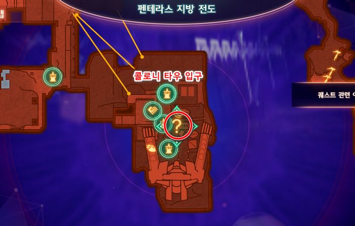 1. 발생조건을 만족시킨 후, 펜테라스 지방 '콜로니 타우'의 ?에 접근하여 퀘스트를 수주받습니다.