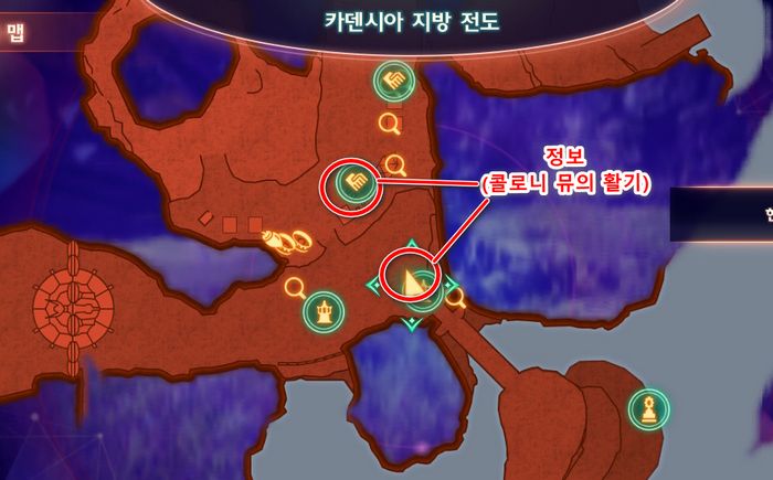 1. 카덴시아 지방 '콜로니 뮤'에서 정보(콜로니 뮤의 활기) x2 획득후, 휴식포인트에서 상담하여 퀘스트를 수주받습니다.