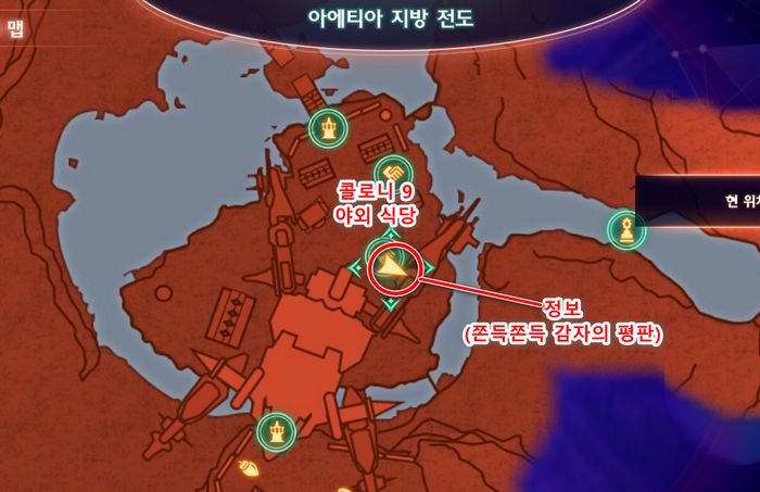 - 콜로니9 야외 식당 근처에서 정보(감자 애호) 획득후 상담하면 보너스 경험치 100EXP 획득