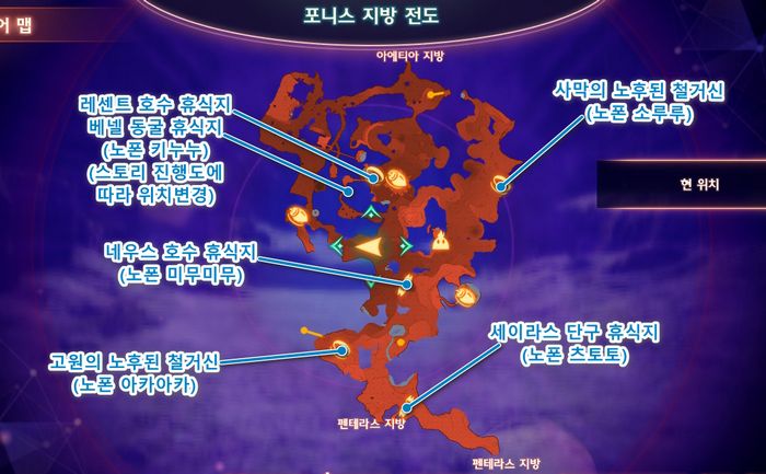 - 포니스 지방 휴식포인트 '베넬 동굴 휴식지'의 '키누누'와 대화(빨강 노폰석 x1) 메인스토리가 어느정도 진행되면 '키누누'가 휴식포인트 '레센트 호수 휴식지'로 이동합니다.