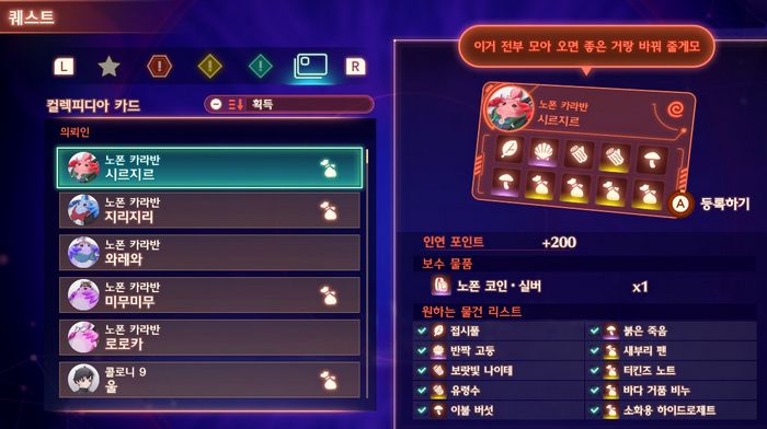 컬렉피디아 카드는 의뢰인이 원하는 소재를 납품하면 각종 보수와 인연 포인트를 받을 수 있는 퀘스트 입니다.