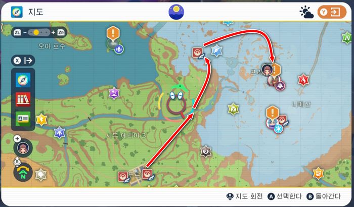 참푸르마을 동부 → 서부 에리어 3 → 나페산 포켓몬센터 → 프리지마을 순으로 이동합니다.