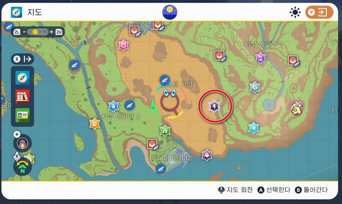 6성 테라레이드 배틀은 검은 결정이며, 지도에서 보면 아이콘 테두리가 빛이 나기 때문에, 5성 이하의 아이콘들과 구별됩니다.