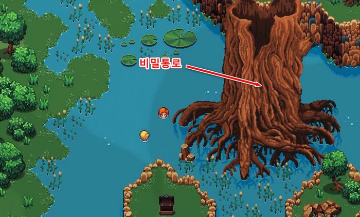 그 바로 위쪽에 커다란 죽은 나무가 있는데, 죽은 나무 뒤쪽으로 이동후, 아래로 내려가면 숨겨진 비밀통로가 있습니다.