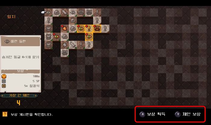 그리고 마치 빙고게임을 하듯이 체인 보상이란 것도 있어서 가장 긴 연결 길이에 따라 추가 보상도 받을 수 있습니다. Y버튼(XBOX 게임패스 기준)을 누르면, 체인보상을 받을 수 있습니다.