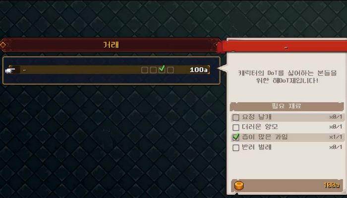 거래는 상인에게 어떤 특정 아이템을 판매하면, 그 아이템과 조합된 특별한 물품이 해제되어 구입할 수 있게 됩니다.
