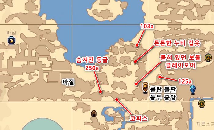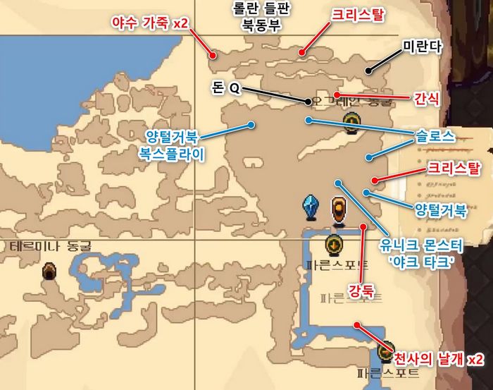 - 슬로스가 출몰하는 곳(롤란 들판 동쪽 끝) 부분에는 오그레인 동굴로 내려가는 절벽 길이 있습니다.