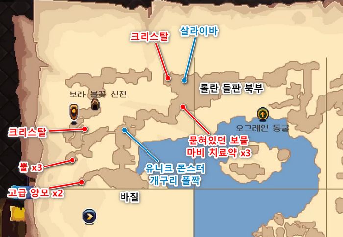 - 유니크몬스터가 있던 곳으로 되돌아와 남쪽으로 내려가면 다리를 건너 서쪽 길 끝 보물상자에 고급 양모 x2