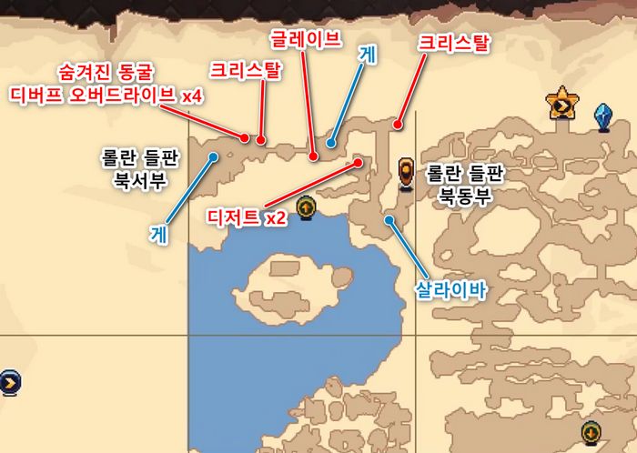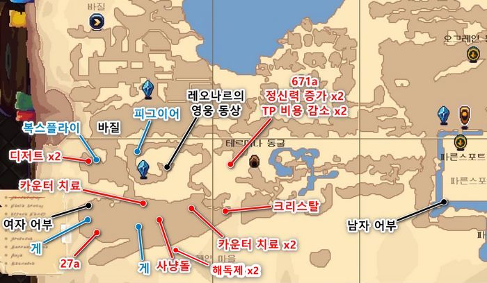 - 크리스탈 좌측 절벽에 숨겨진 동굴이 있으므로, 바위를 조사후 동굴안 보물상자에서 디버프 오버드라이브 x4 획득