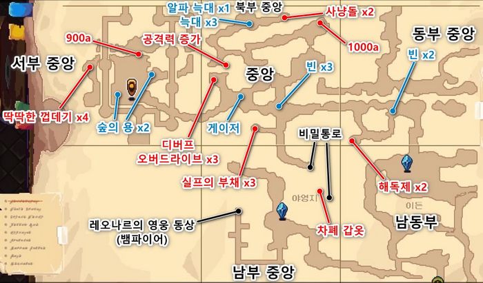 - 중앙에는 숲이 있으며, 가로등 아래 빨간 보물상자에서 마법사 벨트(장신구) 획득