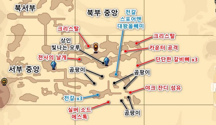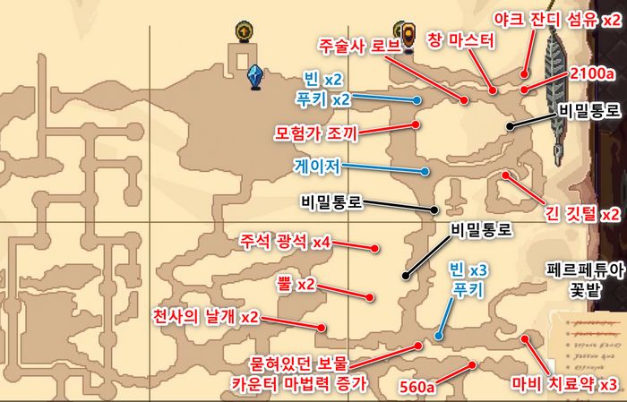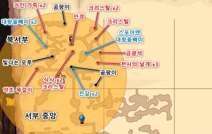- 스포어맨, 대왕올빼미가 있는 위치에서 남동쪽 보물상자에 천사의 날개 x3. 동쪽 보물상자에 금광석. 북동쪽에 크리스탈. 그리고 북쪽으로 올라가면 2개의 길이 나오는데, 서쪽으로는 빨간보물상자에서 안경(장신구) 획득. 북동쪽에는 크리스탈 x2