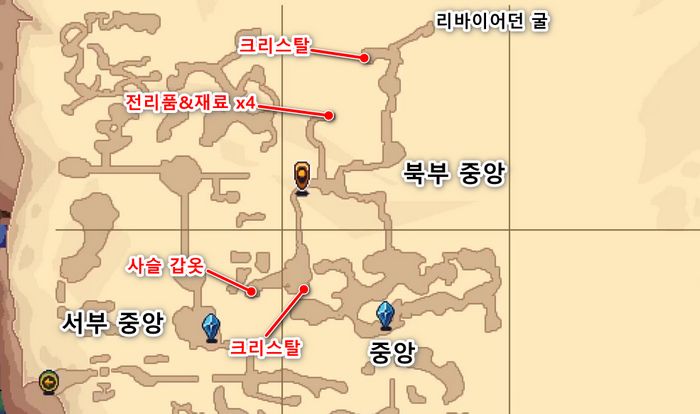 - 넓은 공간에서 북쪽으로 올라간 뒤, 동쪽으로 가면 크리스탈 x3