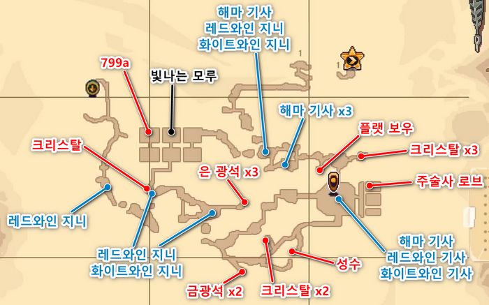 - 좀더 북동쪽으로 가면 넓은 공간이 나타나며 그곳에서 해마 기사 x1, 레드와인 지니 x1, 화이트와인 지니 x1과의 교전