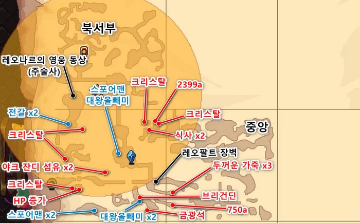 - 빠른이동 크리스탈에서 북쪽으로 가면 첫번째 다리가 있는데, 첫번째 다리 좌측에 길이 있어서 그 길을 따라 서쪽으로 가면 크리스탈. 크리스탈에서 남쪽으로 내려가면 커다란 빨간나무 좌측에서 절벽을 오를 수 있으며, 그곳에 2번째 크리스탈. 2번째 크리스탈에서 북서쪽 절벽을 올라가면 전갈 x2와 교전. 전갈x2이 있는 곳에서 북쪽으로 가면 북서부 영역으로 화면이 전환되며 그곳에 레오나르의 영웅 동상이 있습니다. 성수를 바치고 기도하면 전갈 x2, 대왕올빼미 x2와 교전. 승리한 주술사 레니아에게서 '주술사' 클래스 엠블럼 획득
