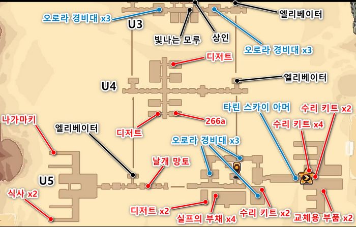 - 이제 동쪽끝의 엘리베이터로 돌아가, U5로 돌아갑니다. (U4에는 서쪽 끝에도 엘리베이터가 있습니다만, 거기로 가면 길이 막혀있으므로, 동쪽끝의 엘리베이터를 타고 U5로 가야합니다)