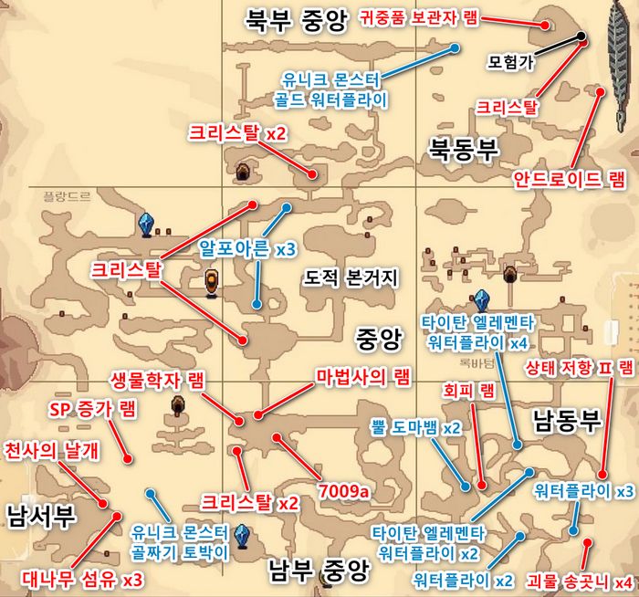 - 큰 섬에서는 금속상자에서 '귀중품 보관자 램'. 크리스탈도 1개 있고, 바로 옆의 모험가와 대화하면 유니크 몬스터에 대한 단서를 줍니다.