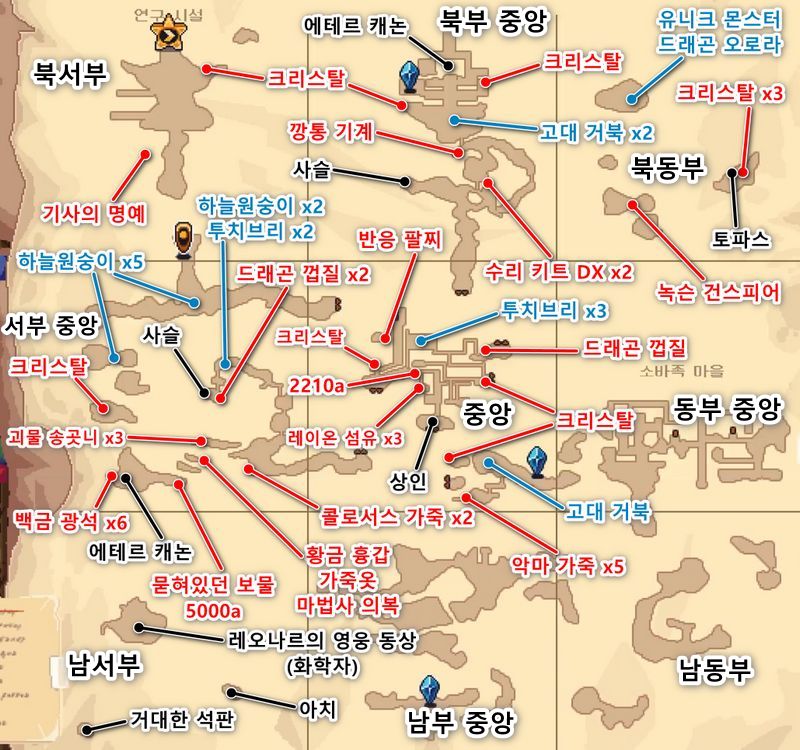 - 빠른이동 크리스탈에서 남서쪽으로 절벽 아래를 내려가면 보물상자에서 악마 가죽 x5