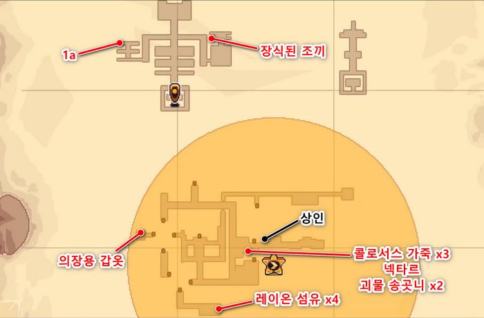 - 창고 남서쪽 보물상자에서 콜로서스 가죽 x3, 남쪽 보물상자에서 넥타르 x1, 북쪽 보물상자에서 괴물 송곳니 x2 획득