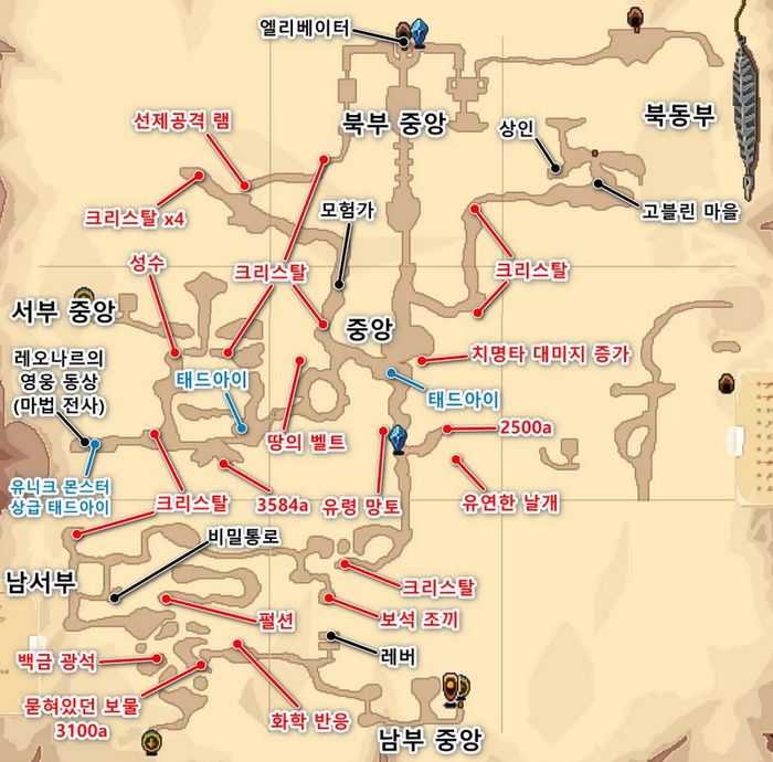 - 남서부 영역에서 서쪽으로 조금 이동하면 풀밭이 보이고, 선인장이 2그루 서있는 곳에 숨겨진 동굴이 있으므로, 그안 보물상자에서 화학 반응 크리스탈 획득