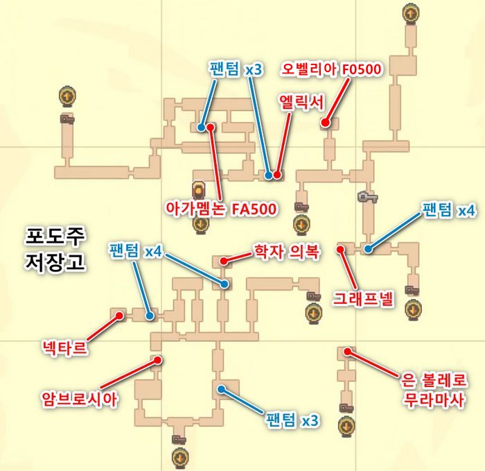 - 아까 거대한 빨간 용이 있던 곳에서 동쪽에 잠긴 철창문이 있습니다. 그 안으로 들어가면 포도주 저장고로 가게 되며, 거기서 북쪽으로 문을 열고 올라가면 금속상자에서 오벨리아 F0500