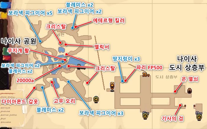 - 다시 도시 상층부로 되돌아와, 도시 상층부 남쪽에 있는 잠긴 문을 '은 열쇠'를 사용해 작동시키면, 나이사의 입구(남동부 영역)로 가는 지름길이 개방됩니다.