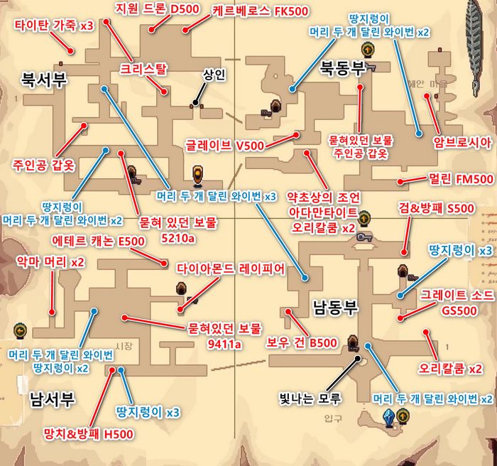 - 시장의 서쪽으로 가면 땅지렁이 x2, 머리 두 개 달린 와이번 x1과 교전