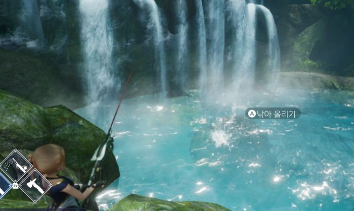 그럼 스태미나가 조금 감소하게 되며, 낚싯대를 던지게 되는데, 기다리다가 낚시 찌가 당겨져서 수면에 하얀색 물거품들이 튈때 "낚아 올리기" 버튼을 눌러주기만 하면 됩니다.