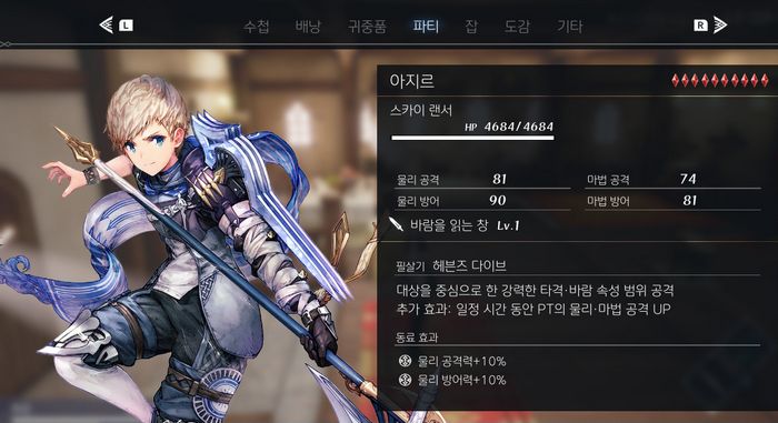 보상 - 물리 방어력 +1% / 물리 공격력 +1% / 큰 바람의 코어 x4 / 인연의 돌 - 스카이 랜서 x1