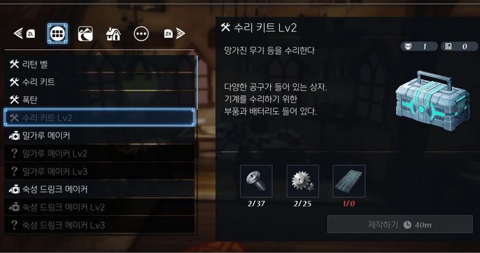 그러면 제작대에서 수리 키트 Lv2를 제작할 수 있습니다.