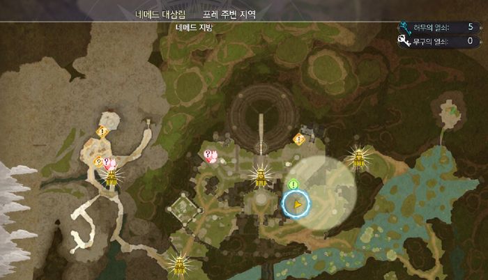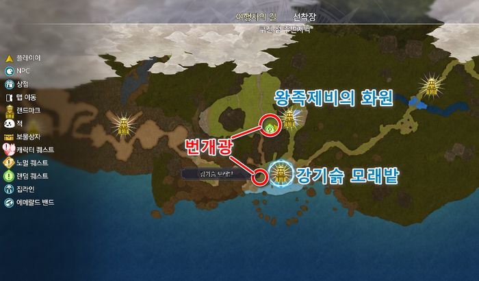 쿠켄 섬 북쪽에 있는 '여행자의 길'에서 랜드마크 '강기슭 모래밭' 과 '왕족제비의 화원' 주변에 번개광 채집 포인트가 있습니다. (그외에도 번개광은 거대 등대, 옛 채굴장 터, 거대 물레방아, 광산 쉼터, 첨정의 숲 등등 다양한 곳에서 채집가능합니다)
