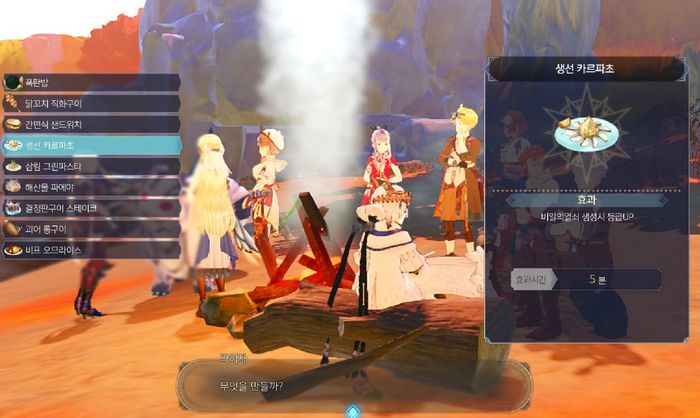필드 상에 있는 '모닥불'에서 요리 '생선 카르파초'를 먹으면 5분간 비밀의 열쇠 생성시 등급 UP 효과가 발휘된다고 합니다.