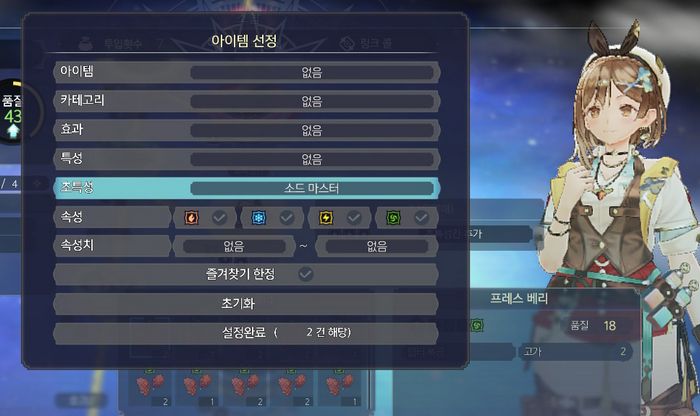 조합 화면에서 X버튼을 눌러 서브 메뉴 > 범위축소 > 초특성 > 소드 마스터 를 선택하면, 소드 마스터 초특성이 붙은 소재를 쉽게 확인할 수 있습니다. (소지하고 있지 않은 경우 표시되지 않습니다)