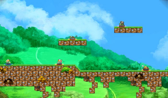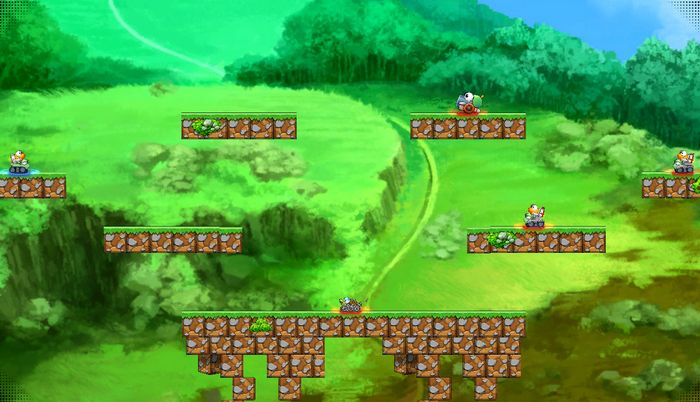 보스 '듀크'의 공격은 앞쪽 공중 섬이 장애물이 되어 막히기 때문에, 피해를 전혀 받지 않고 보스를 공격할 수 있습니다.