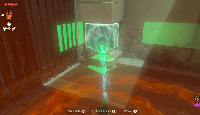 석판을 붙인 얼음 큐브를 시작지점 근처에 있던 화염 폭포로 가지고 와서, 불길을 차단합니다.