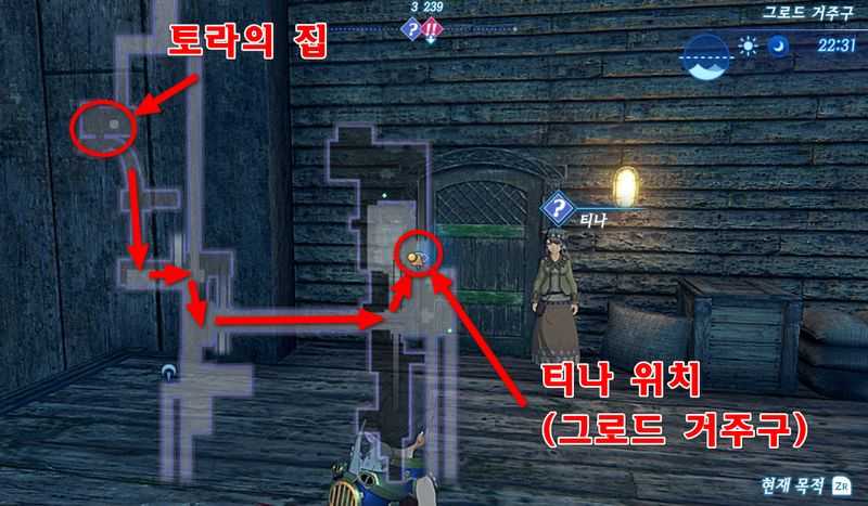 토라의 집으로 나온 뒤, "갈레드 거주구"를 지나 "그로드 거주구"에 있는 "티나"에게 대화하여 퀘스트를 수주받습니다.