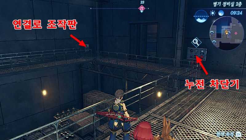 느낌표(!)를 따라 이동하다보면 병기 정비실에 도착하며, 안쪽으로 들어가면 이벤트가 발생합니다.