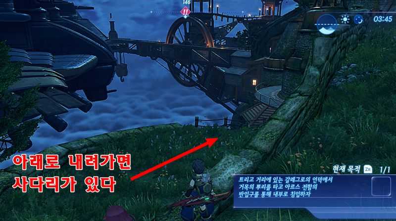 거목의 뿌리를 타고 아르스 전함의 반입구를 통해 내부로 칩입합니다. 사다리 표시를 따라 아래로 계속 내려갑시다. 자칫 추락하지 않게 주의하세요.