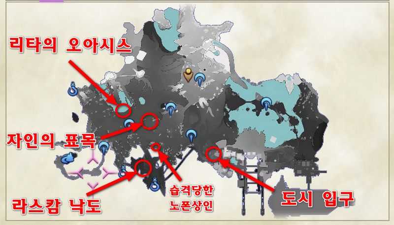 또한 고르다 대평원의 동쪽으로 이동하면 랜드마크 "자인의 표목"이 있습니다.