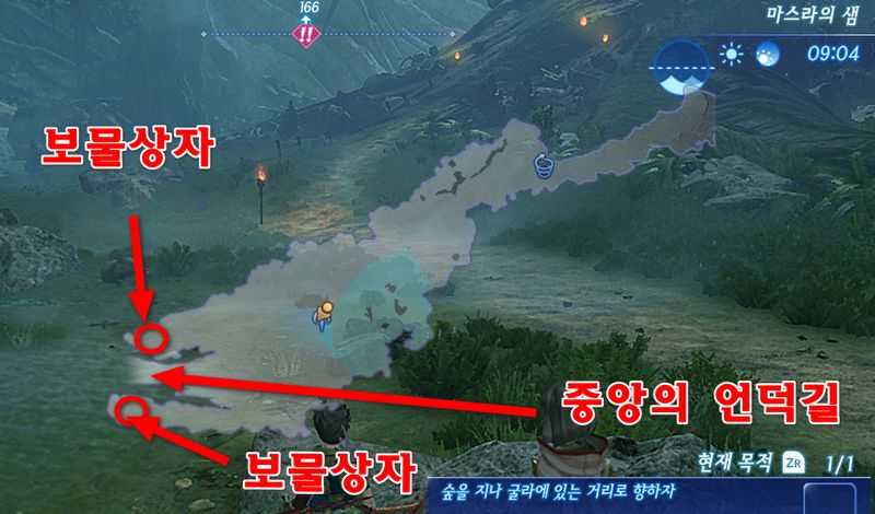 마스라의 샘에서 언덕 양쪽에 있는 보물상자들을 획득하고 갑시다. 구체적인 것은 사진을 확인해주세요. "팽 칩" 아이템과 골드를 획득할 수 있습니다.