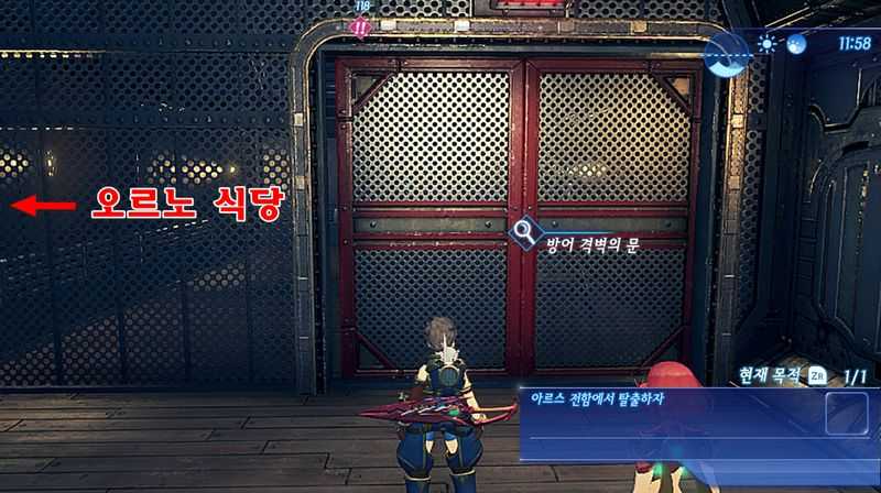 거주구나 오르노 식당 쪽으로 되돌아와 "방어 격벽의 문"을 엽니다. 그후 계단을 타고 위로 올라갑시다.