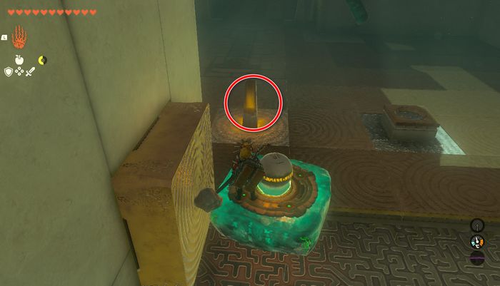 발사대 옆에 있는 부유석 위에 철구슬을 붙인 후, 같이 탑승한 상태로 바로 옆의 노란 스위치를 화살로 맞춰 기동합니다.