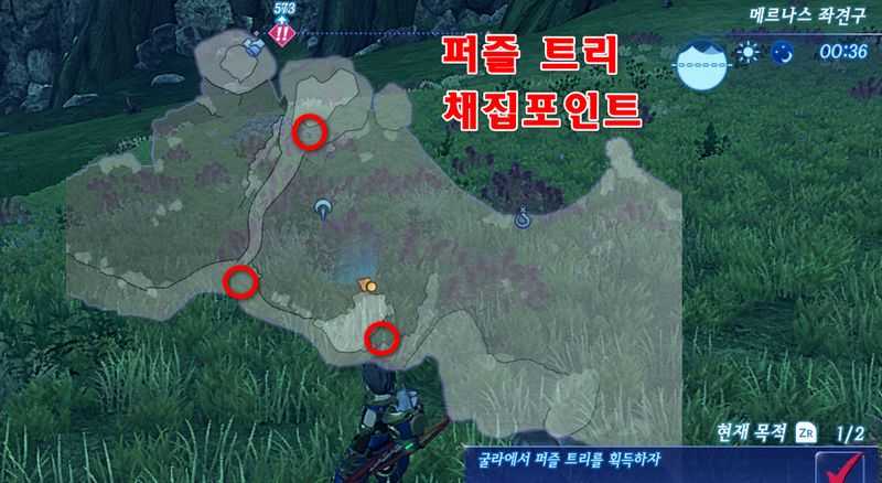 위 사진에서 동그라미가 쳐진 부근의 채집 포인트에서 퍼즐 트리가 나옵니다. 10개 수집합시다. 스킵 트래블을 사용하면 채집포인트가 부활합니다.